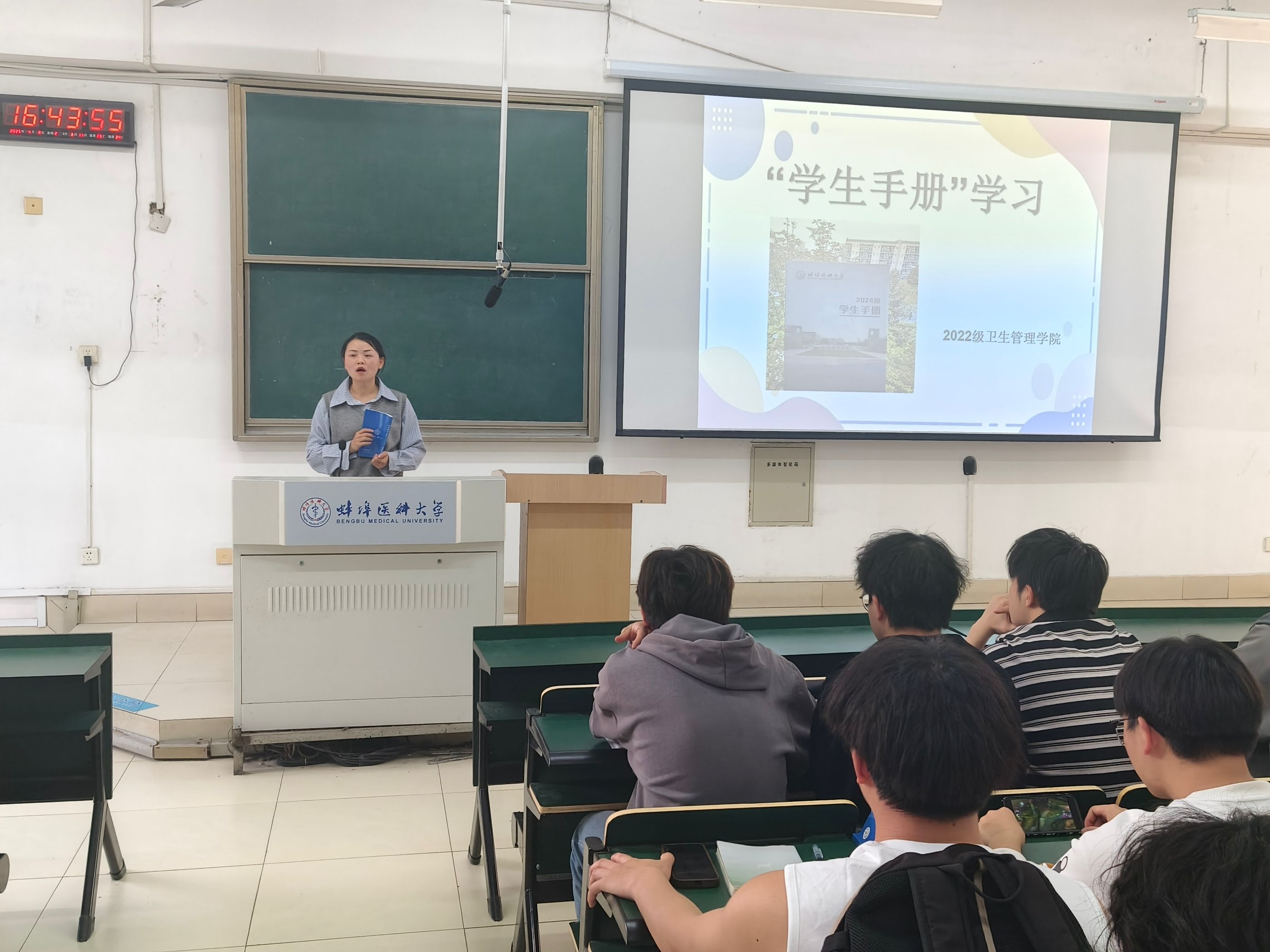 为进一步强化学生对学校规章制度的认知,有效提升学生的纪律意识,规范日常行为,2025年4月9日中午,卫生管理学院组织2022级全体学生开展《学生手册》专题学习活动。