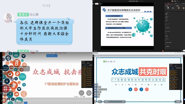 2017级辅导员和团支书以“众志成城 共克时艰”为主题,给同学们科普新型冠状病毒是什么,发病特征如何,以及作为大学生如何不信谣不传谣。同时,号召同学们“宅”家上网课仍要保证质量,不能“浑水摸鱼”。