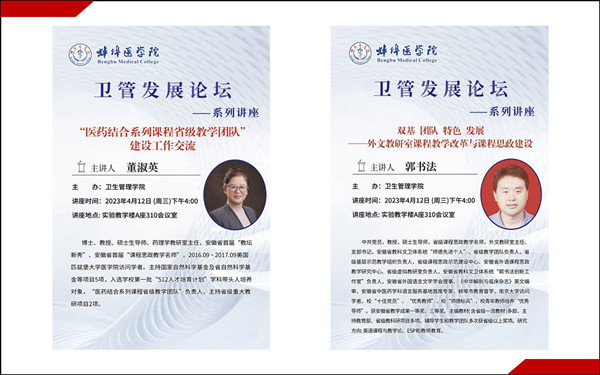 为深入学习贯彻党的二十大精神和习近平总书记关于教育的重要论述,大力加强教科研团队建设,推进学科交叉融合,提升教师教学与科研能力素质,卫生管理学院近日举办了“蔚观杯”年度发展论坛首场讲座。本次讲座邀请了药学院董淑英教授、公共基础学院郭书法教授作辅导报告。学院全体教师与研究生、部分其他学院教师30余人参加了本次活动,院长高琴主持讲座。