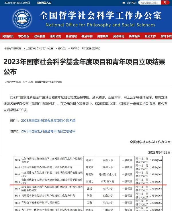近日,全国哲学社会科学工作办公室公布了2023年国家社科基金年度项目和青年项目立项名单。学院王辅之教授申报的项目《数智时代老年人居家数字健康资源应用障碍及干预策略研究》(23BTQ063),获批国家社科基金一般项目立项。