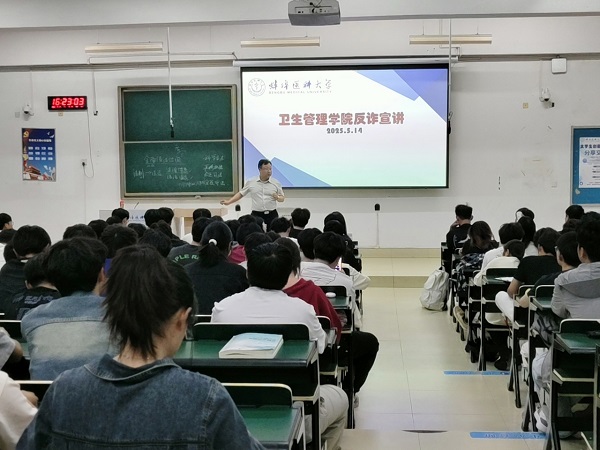 为增强学生防范诈骗意识,筑牢校园安全防线。2025年5月14日下午,卫生管理学院邀请了蚌埠市公安局反电诈中心魏玉峰于理论楼101教室举办反电信诈骗专题教育宣讲会。宣讲会由卫生管理学院党总支副书记贾先果主持,年级辅导员王俊、张瑜及在校300余名学生参会。