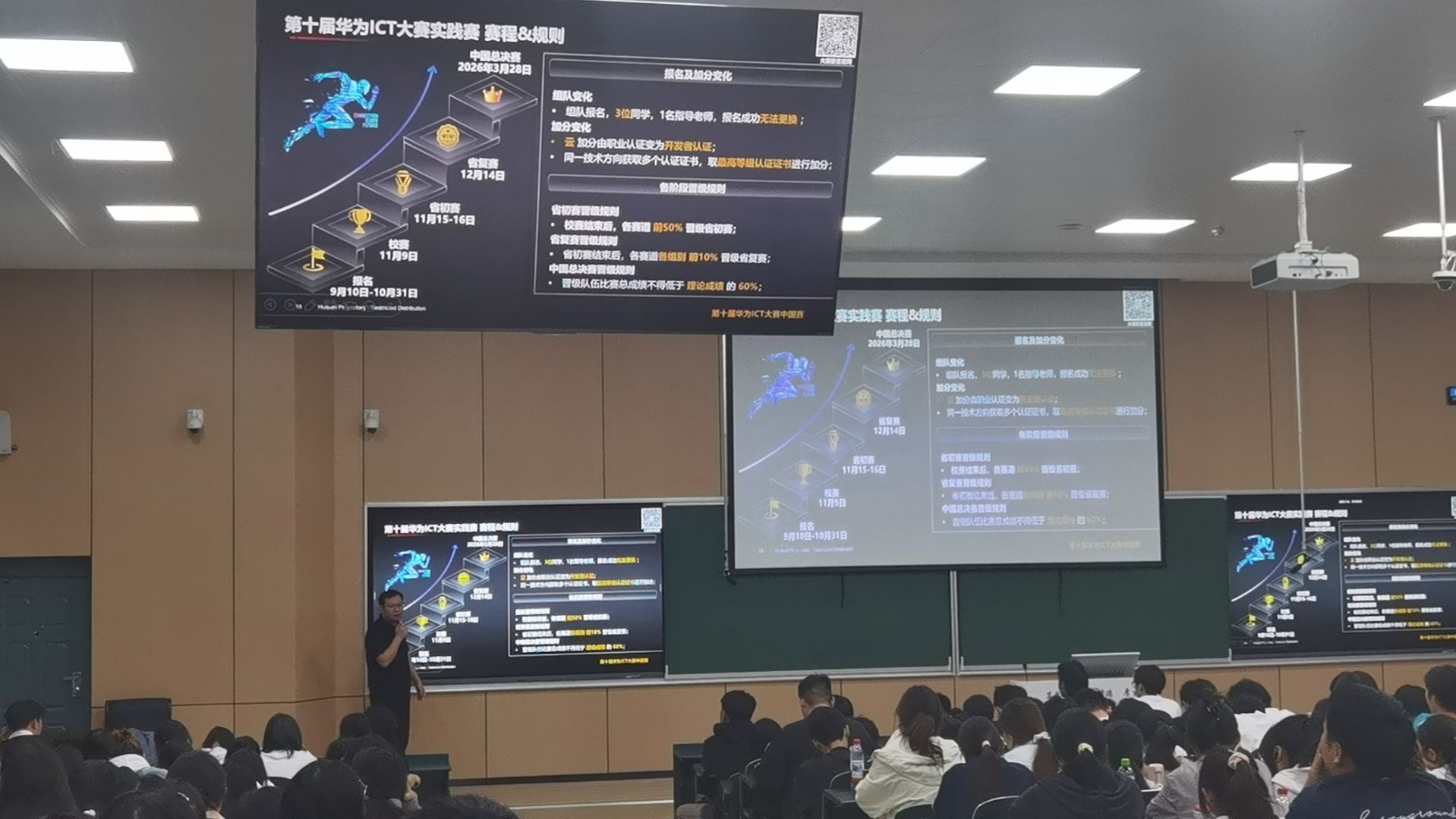 宣讲会上,张强老师详细介绍了华为ICT大赛的发展历程及其重要意义,鼓励学生们深入学习华为相关课程,踊跃参加华为ICT大赛。张强老师还结合我国ICT行业的发展趋势,以生动易懂的方式讲解了行业相关岗位设置及实习就业方向,为同学们的职业生涯规划提供了参考。最后,张老师就华为ICT大赛的报名流程、赛道设置、方向选择和加分政策等内容进行了全面说明,并分享了实用的备考策略和学习资源。