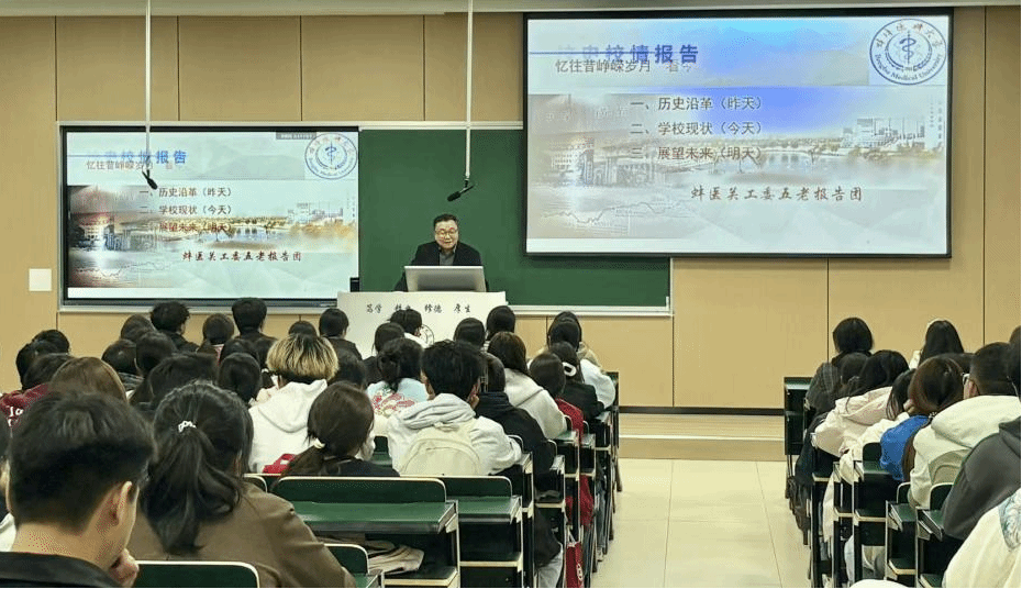 报告会上,关宿东教授围绕历史沿革(昨天)、学校现状(今天)、展望未来(明天)的逻辑主线,从学校创办背景、发展历程、办学特色、师资水平、人才培养、改革创新、校园文化等核心维度,系统讲述了学校自创办以来的光辉岁月与辉煌成就。他通过首任院长谢炘等蚌医前辈的感人事迹,深刻诠释“笃学、精业、修德、厚生”的蚌医校训内涵,鼓励新生以老一辈蚌医人为榜样,秉持恒心、善于共处、直面挫折、遵行善良、护佑健康,牢记医者初心,勇担报国使命,将个人成长融入学校发展与国家建设之中。