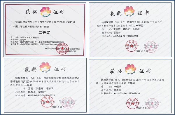 在参赛师生的共同努力下,由翟菊叶老师指导,宋雨洁、曾静文、肖鹏程团队的作品“二十四节气之旅”荣获微课与教学辅助类国家级二等奖、安徽省一等奖;由邱煜炎、翟菊叶老师指导,宫丽、李康辉、潘梦洁团队的作品“基于口腔医学专业知识图谱诊断对话系统”荣获人工智能应用类安徽省三等奖;由陈春燕老师指导,毕晓桐的作品“汉文化”荣获数媒静态设计类安徽省三等奖。