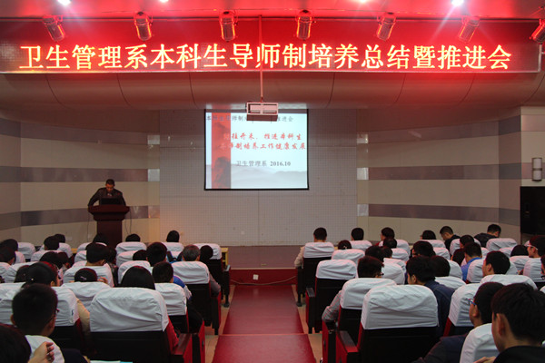 卫生管理系实施本科生导师制工作一年来,在学生培养、导师指导、教育方式方面取得显著成效,为全面总结一年来的本科生导师制工作,更好的推进本科生导师制工作的健康发展,10月27日晚7点,卫生管理系在校学术报告厅隆重召开了本科生导师制培养工作总结暨推进会。卫生管理系本科生导师及全体在校生参加了会议,会议由卫生管理系直属党支部书记张浩主持。