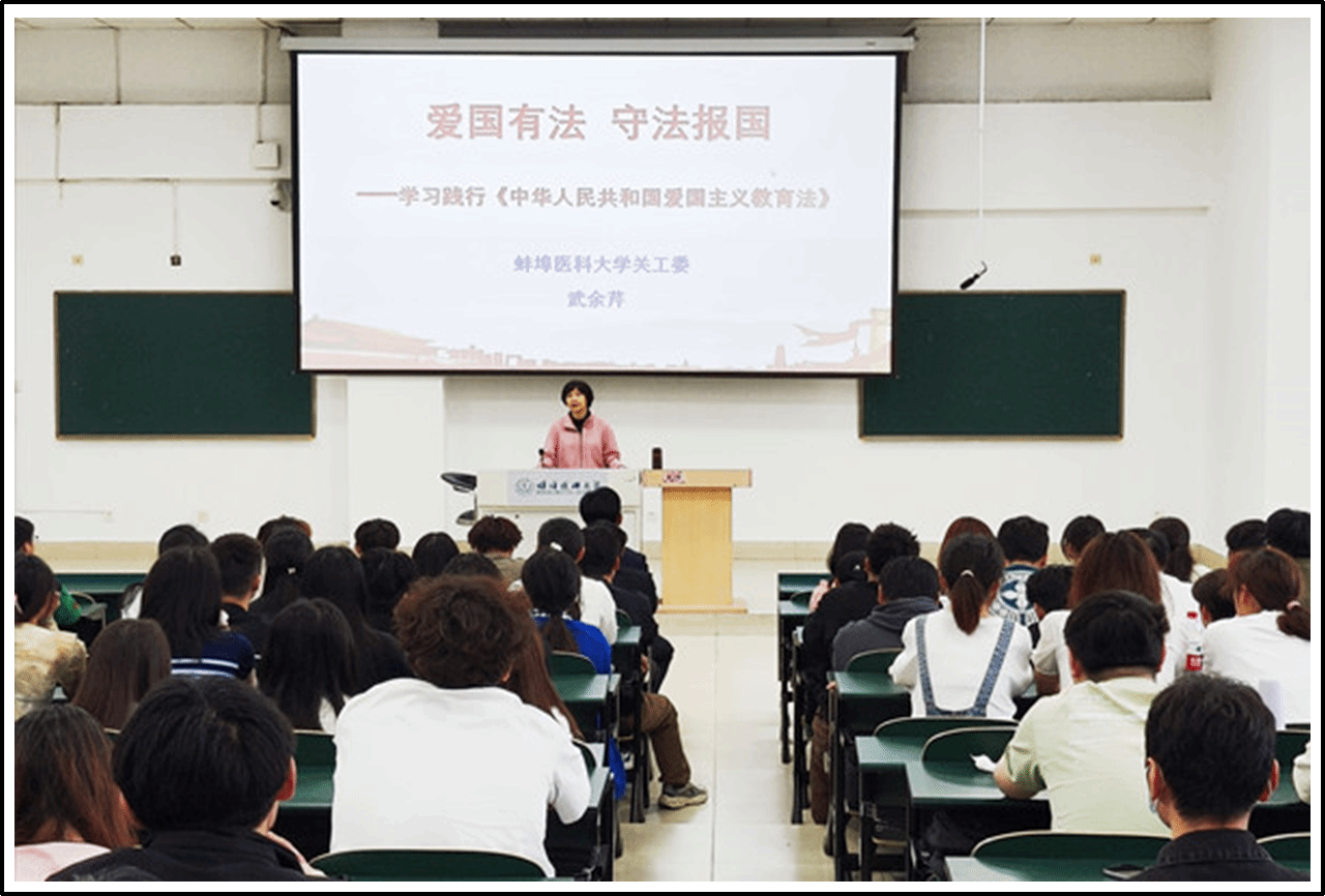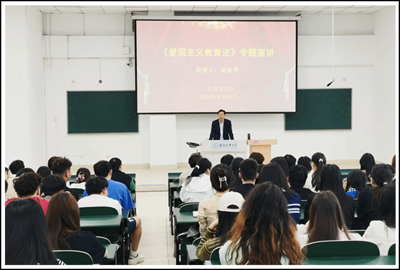 为全面落实立德树人根本任务,加强爱国主义教育法的宣传解读和贯彻实施,引导学生深刻领会爱国主义基本内涵和内在要求,增进集体荣誉感和民族自豪感,卫生管理学院邀请校关工委成员武余芹老师,于4月24日为学生举办了一场《中华人民共和国爱国主义教育法》专题宣讲会。学院党总支书记史永庆主持会议,年级辅导员及220余名学生参会。